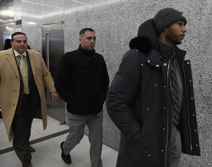Former NYPD Detectives Eddie Martins (center) and Richard Hall (right) leaving Kings County Supreme Court in January.